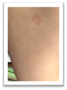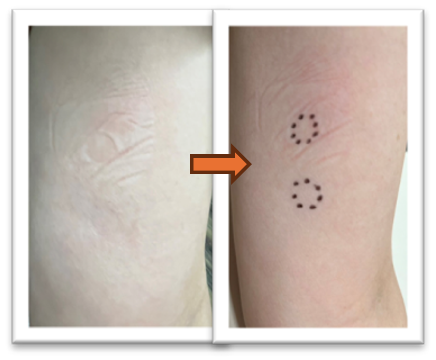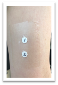 利き腕の反対側に「①ハイドロキノン」と「②ワセリン」を塗布したシールを貼ります。