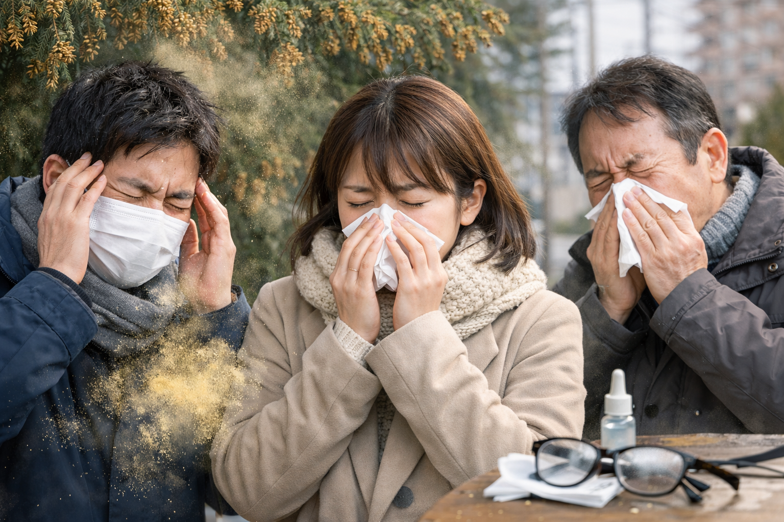 花粉症は、スギやヒノキの花粉が鼻や目の粘膜に触れることで起きるアレルギー反応です。